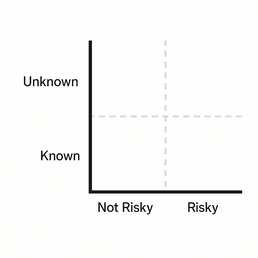 - Draw a 2x2 grid. Table the vertical axis Unknown (top) and Known (bottom). Label the horizontal axis Not Risky (left) and Risky (right).