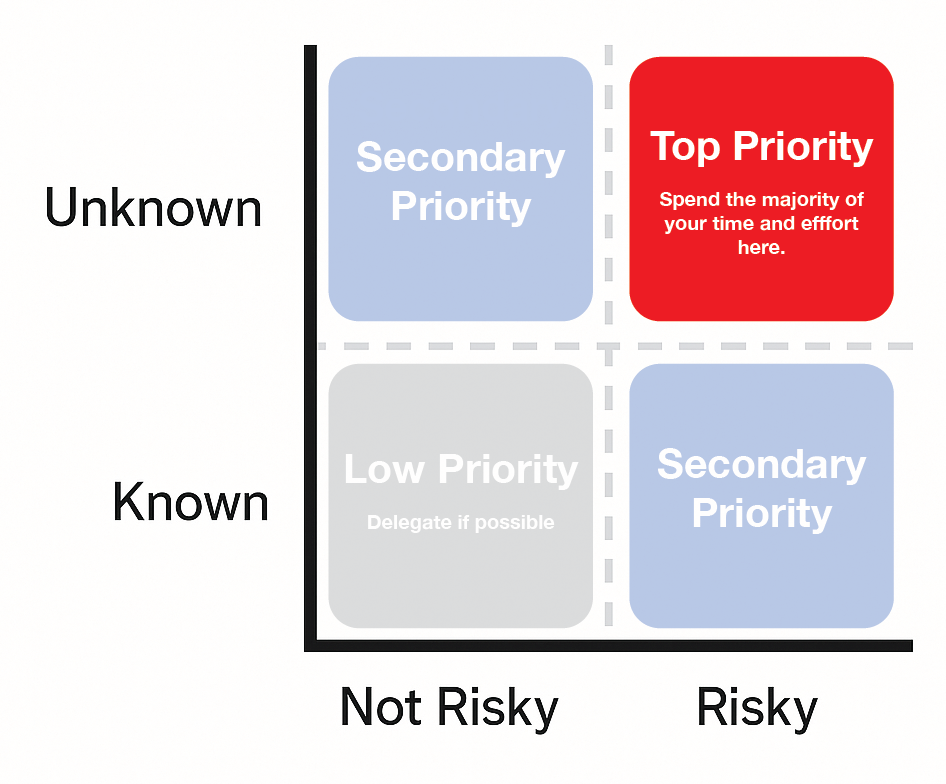 This is where your expertise is needed the most. Unknown/Risky work combines high ambiguity with high consequences. No one is aligned on what needs to exist, how it should work, or what the right answer even looks like, but everyone knows that getting it wrong will hurt.