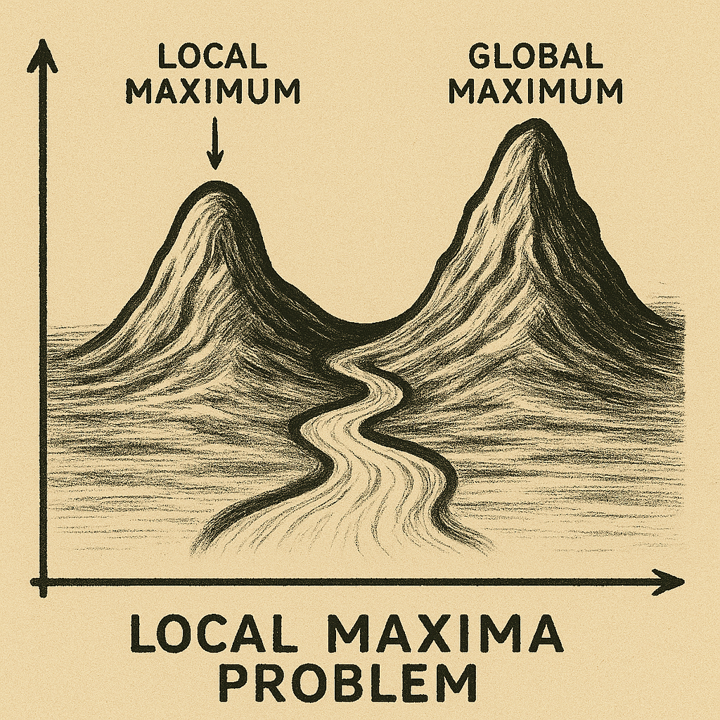 In doing so, it creates a cycle of recursive sameness. In a world driven by AI, products begin to converge in appearance, behavior, tone, and value proposition. This steers companies toward the local maxima.